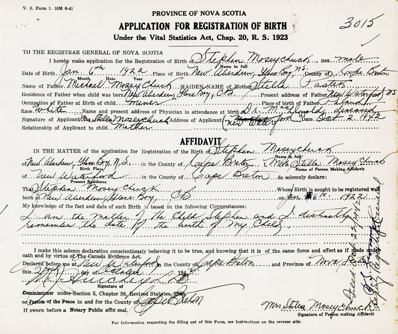 Born at New Aberdeen, Glace Bay in the County of Cape Breton
