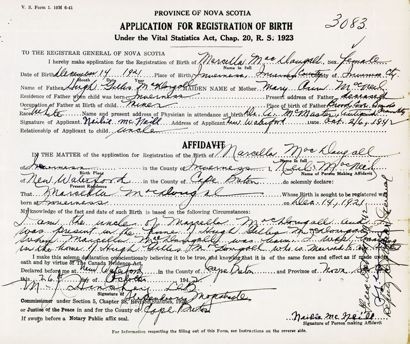 I am the uncle of Marcella MacDougall and was present in the home of Hugh Gillis MacDougall when Marcella MacDougall was born. I was boarding in the home of Hugh Gillis MacDougall who is married to my sister.