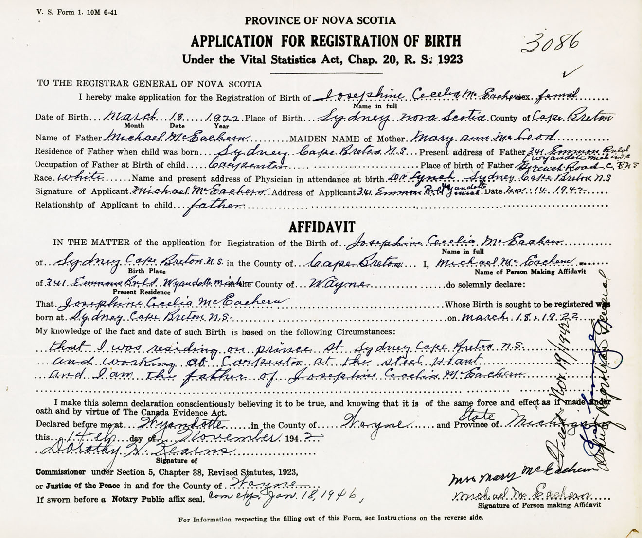 Date of Birth March 18, 1922 Place of Birth SydneyCounty of Cape Breton