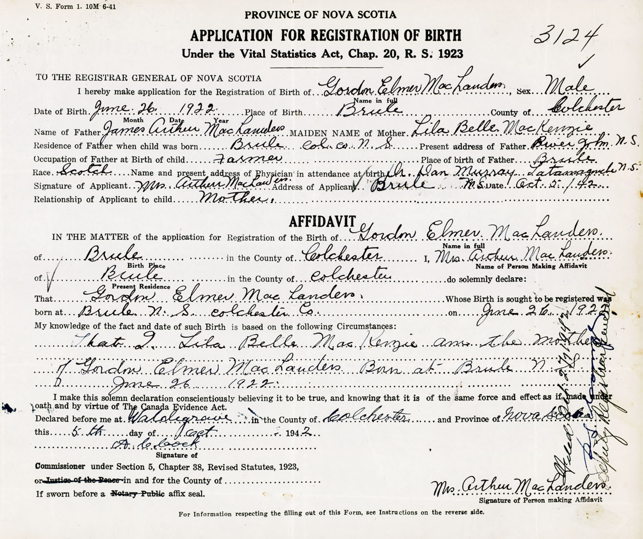 That I, Lila Belle MacKenzie am the mother of Gordon Elmer MacLanders, born at Brule, Colchester Co., NS on 26 June 1922.