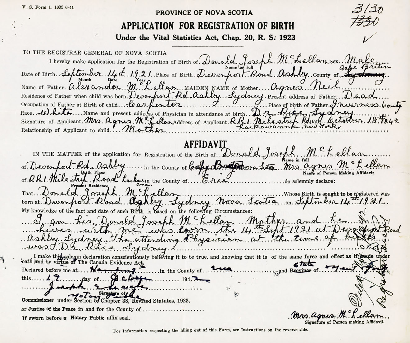 I am his Donald Joseph McLellan mother and he lives with me, was born the 14th September 1921 at Devenport Road, Ashby, Sydney. The attending Physician at the time of birth was Dr. Rice, Sydney, NS.