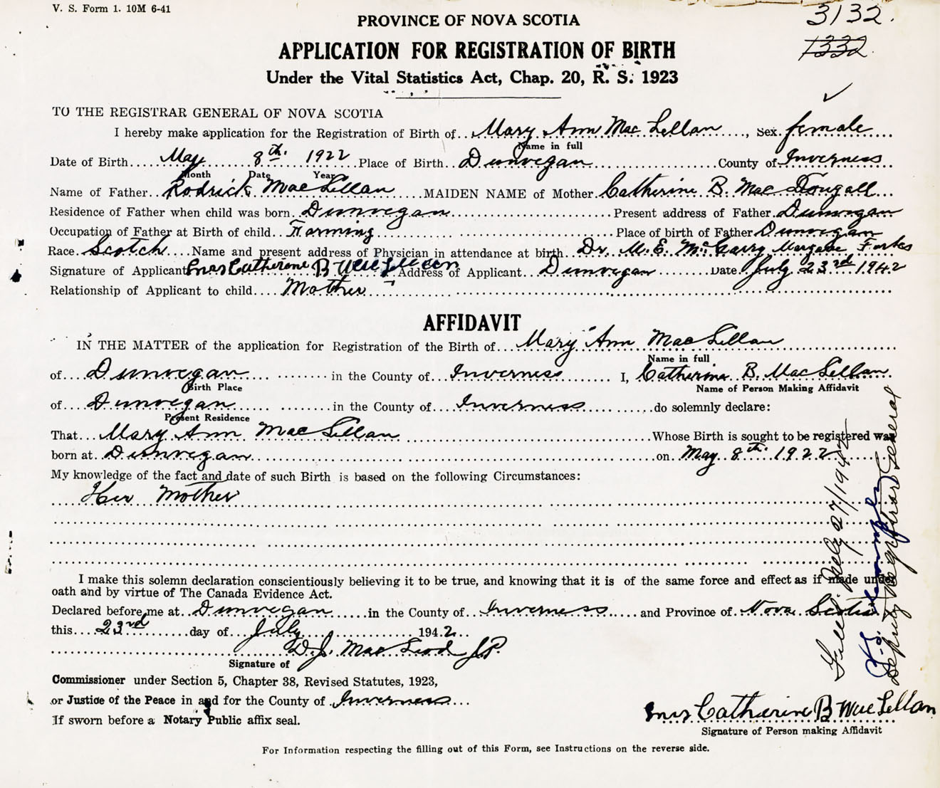 Signature of Applicant Mrs. Catherine B. MacLellan Address of Applicant Dunvegan, Inverness Co., NS Date 23 July 1942