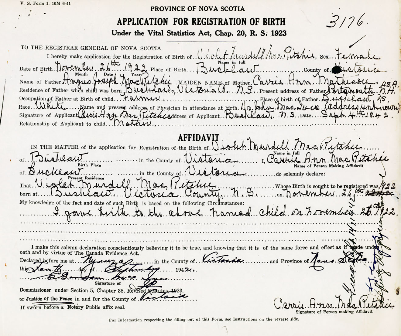 Signature of Applicant Carrie Ann MacRitchie Address of Applicant Bucklaw, Victoria Co., NS Date 4 September 1942