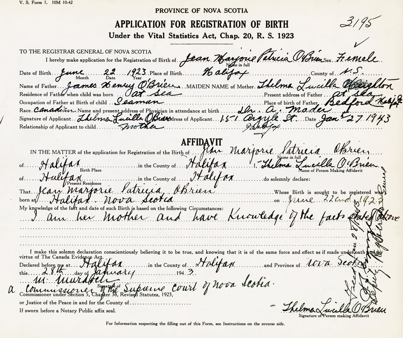 Signature of Applicant Thelma Lucille O'Brien Address of Applicant 151 Argyle Street, Halifax, NS Date 27 January 1943