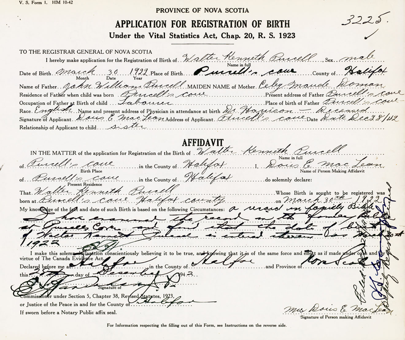 I have examined the record on the family bible at Purcells cove and find that the date of birth of Walter Kenneth Purcell is entered therein as March 30th, 1922.
