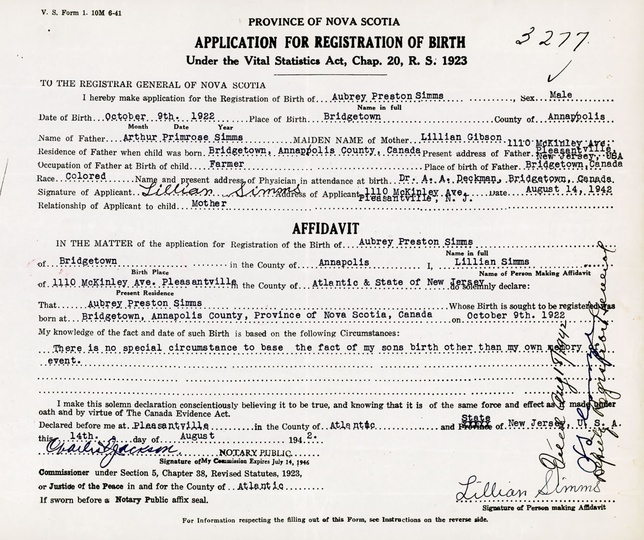 Signature of Applicant Lillian Simons Address of Applicant 110 McKinley Avenue, Bridgetown, Annapolis Co., NS Date 14 August 1942