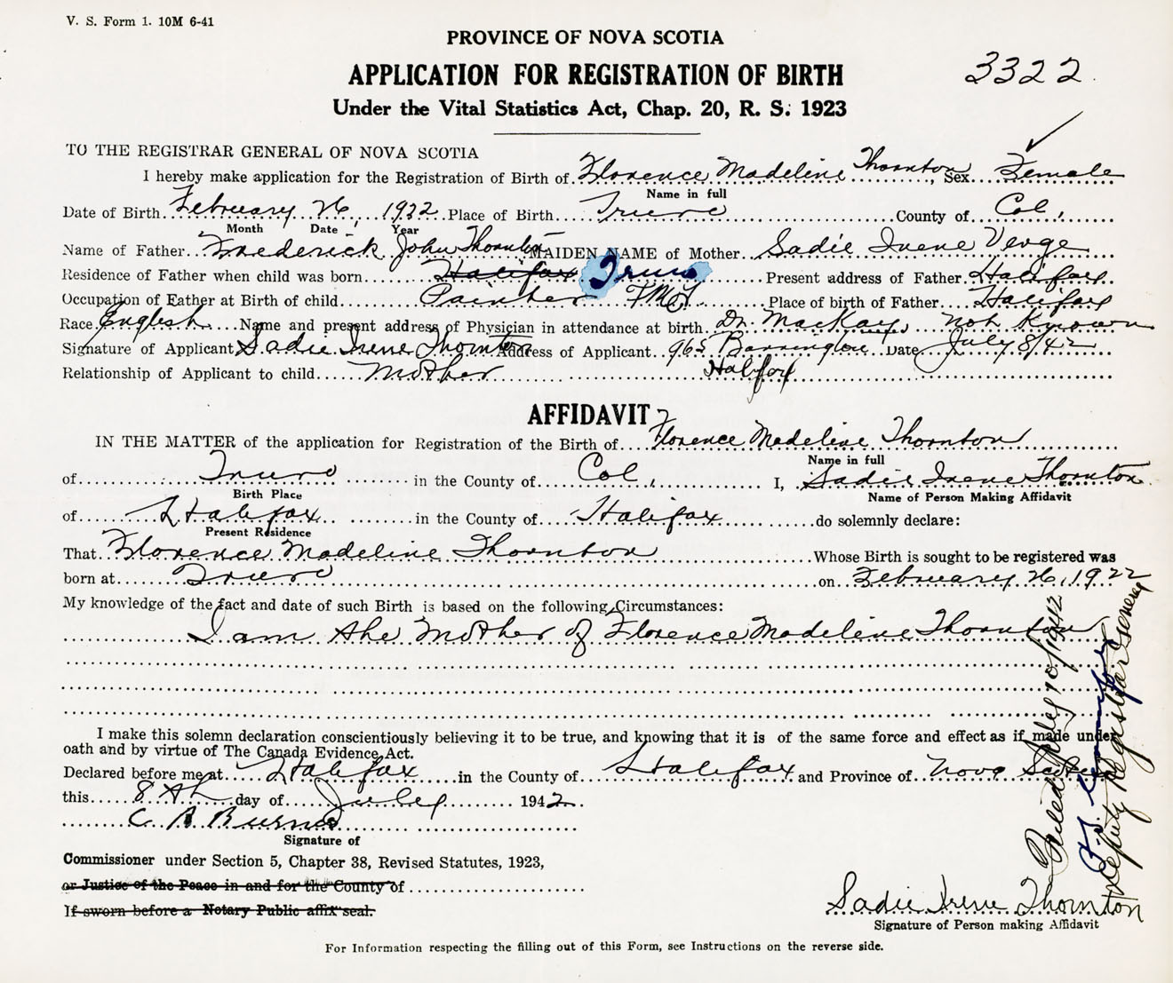 Signature of Applicant Sadie Irene Thornton Address of Applicant 965 Barrington Street, Halifax, NS Date 8 July 1942