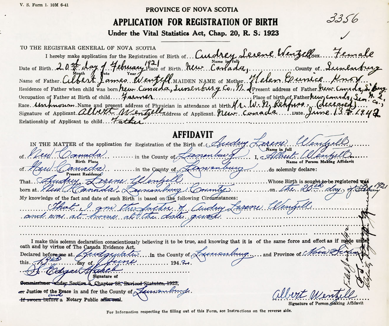Signature of Applicant Albert Wentzell Address of Applicant New Canada, Lunenburg Co., NS Date 13 June 1942