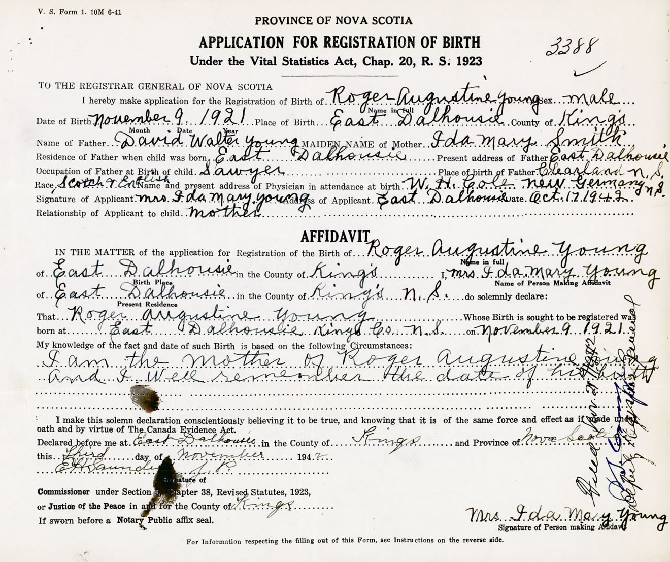 I hereby make application for the Registration of Birth of Roger AugustineYoung Sex Male