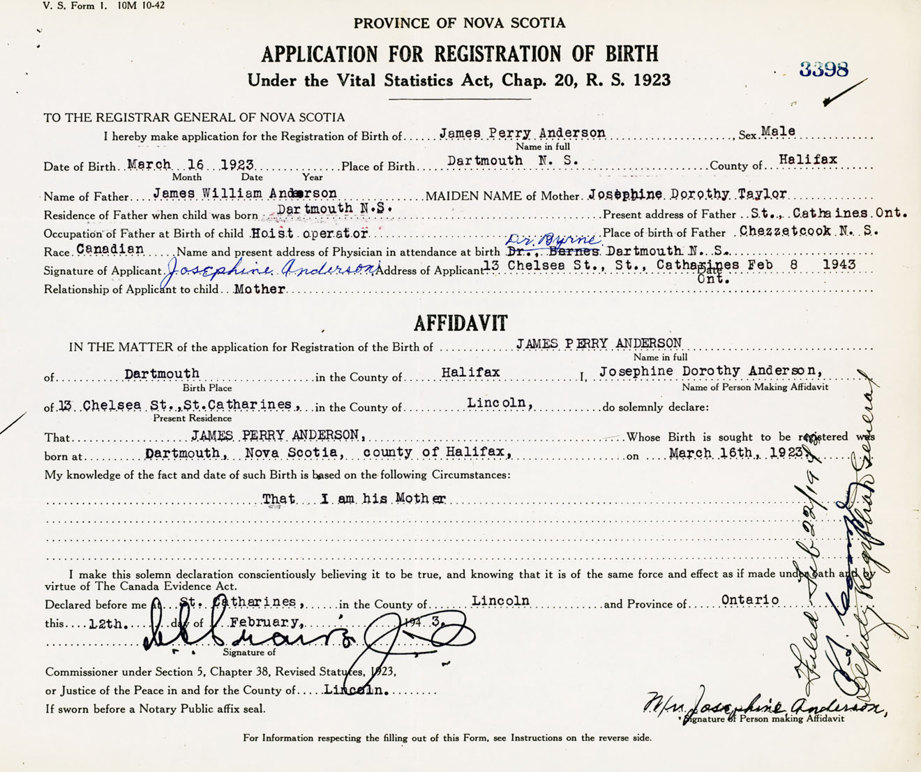 Signature of Applicant Josephine Anderson Address of Applicant 13 Chelsea Street, St. Catharines, Ontario Date 8 February 1943