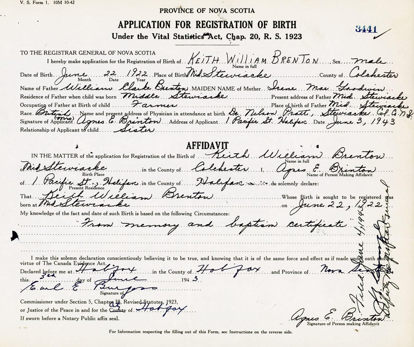 Signature of Applicant Mrs. Agnes E. Brinton Address of Applicant 1 Pacific Street, Halifax, NS Date 3 June 1943