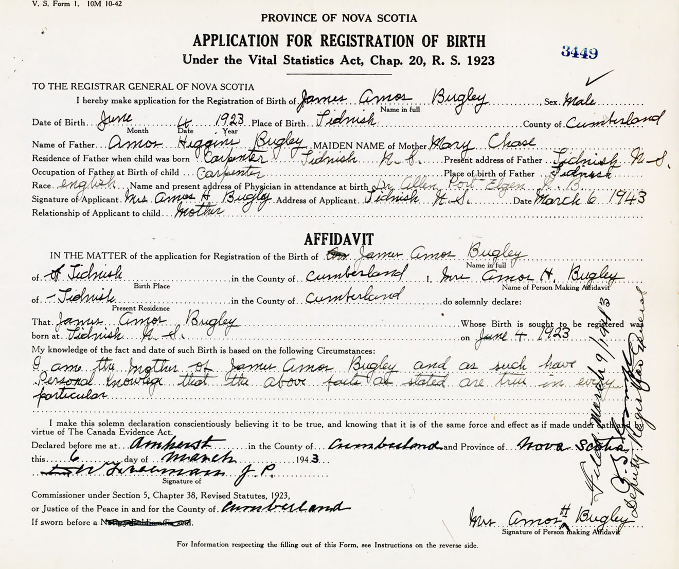 Signature of Applicant Mrs. Amos H. Bugley Address of Applicant Tidnish, Cumberland Co., NS Date 6 March 1943