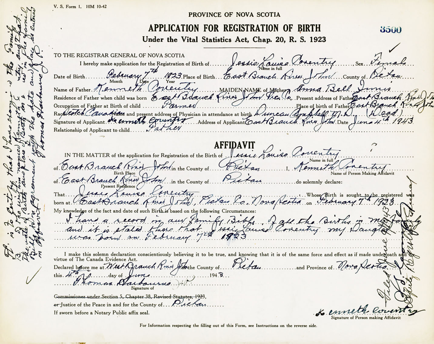 Signature of Applicant Kenneth Coventry Address of Applicant East Branch River John, Pictou Co., NS Date 4 June 1943