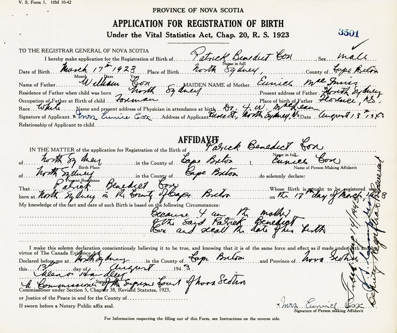 Date of Birth March 17, 1923 Place of Birth North SydneyCounty of Cape Breton