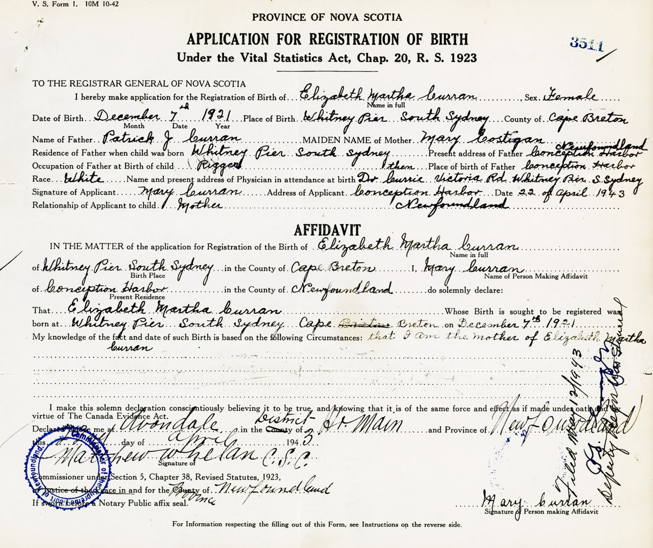 Signature of Applicant Mary Curran Address of Applicant Conception Harbour, Newfoundland Date 22 April 1943