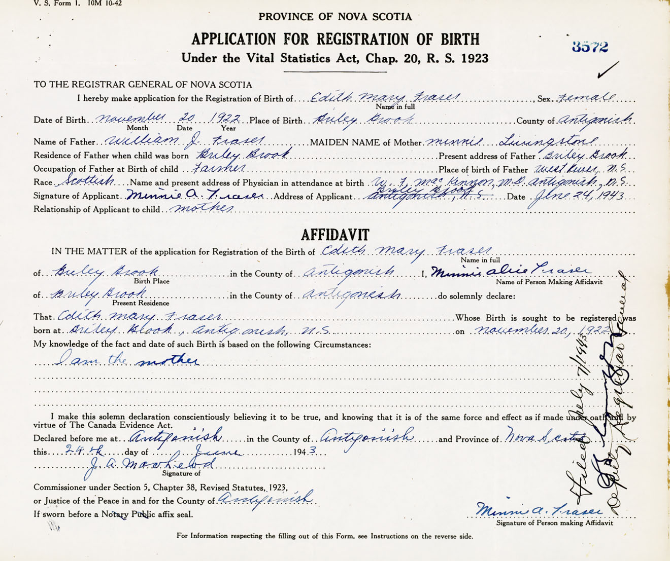 Signature of Applicant Minnie A. Fraser Address of Applicant Brierly Brook, Antigonish Co., NS Date 24 June 1943