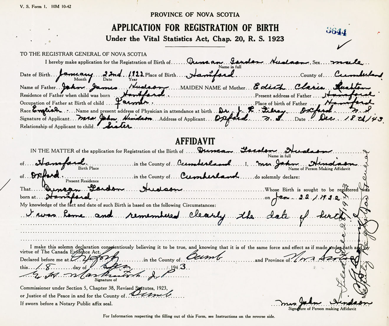 Signature of Applicant Mrs. John Hudson Address of Applicant Oxford, Cumberland Co., NS Date 18 December 1943
