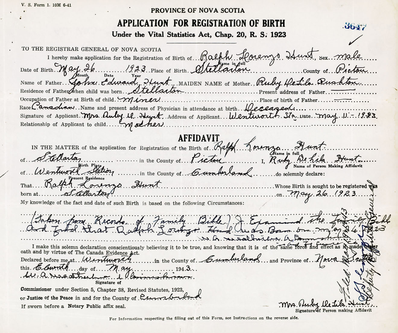 Signature of Applicant Mrs. Ruby D. Hunt Address of Applicant Wentworth Station, Cumberland Co., NS Date 11 May 1943