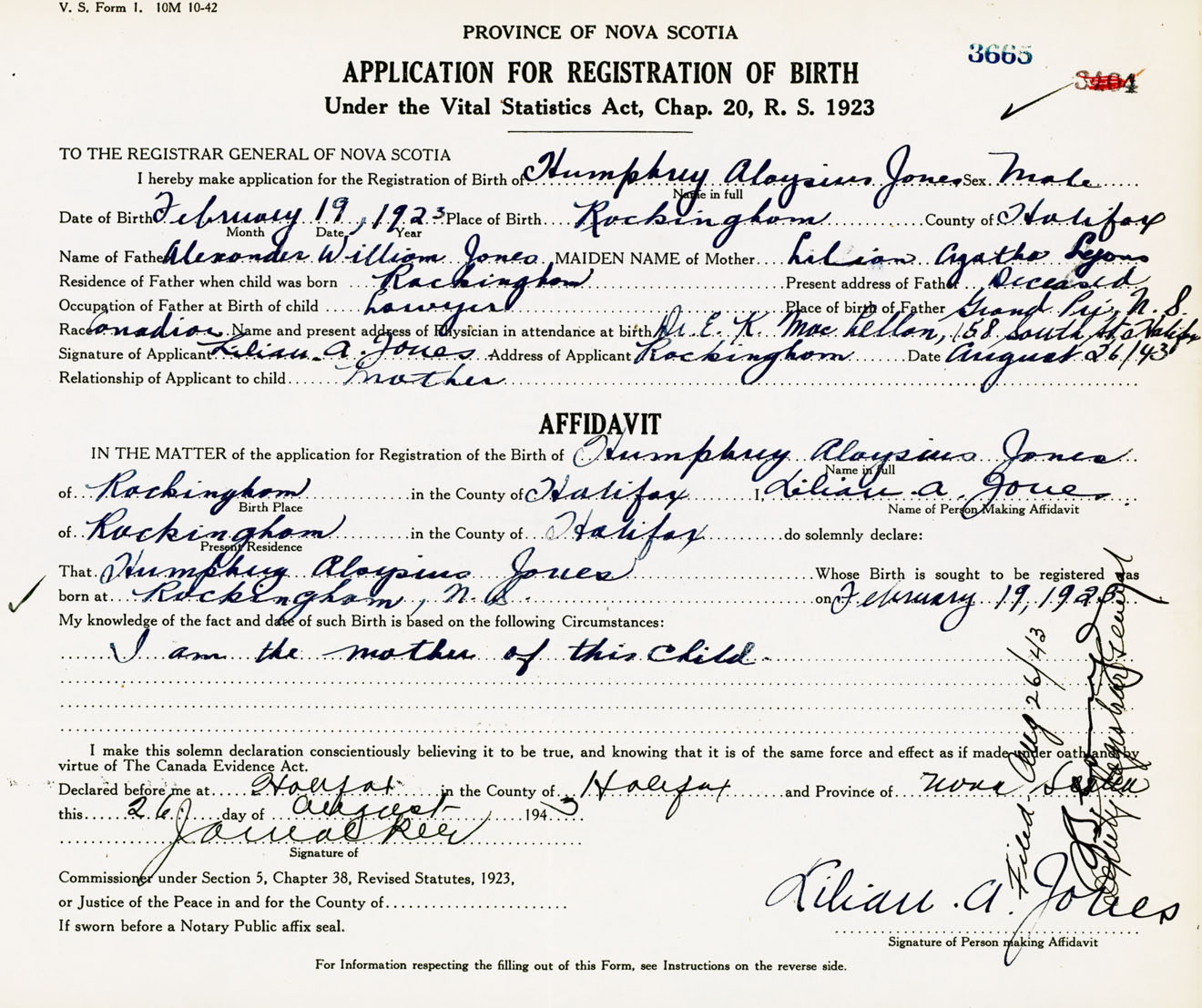 I hereby make application for the Registration of Birth of Humphrey AloysiusJones Sex Male