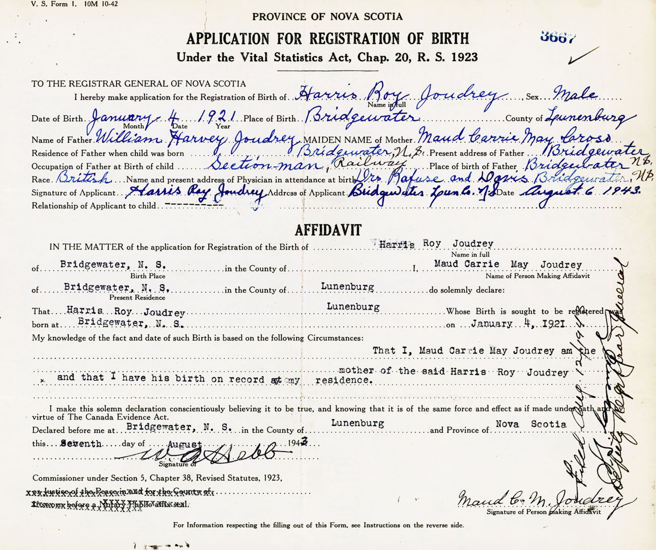 Signature of Applicant Harris Roy Joudrey Address of Applicant Bridgewater, Lunenburg Co., NS Date 6 August 1943