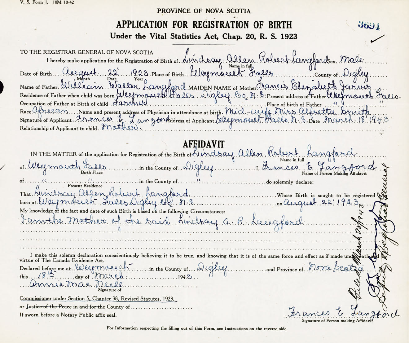 Signature of Applicant Frances E. Langford Address of Applicant Weymouth Falls, Digby Co., NS Date 18 March 1943