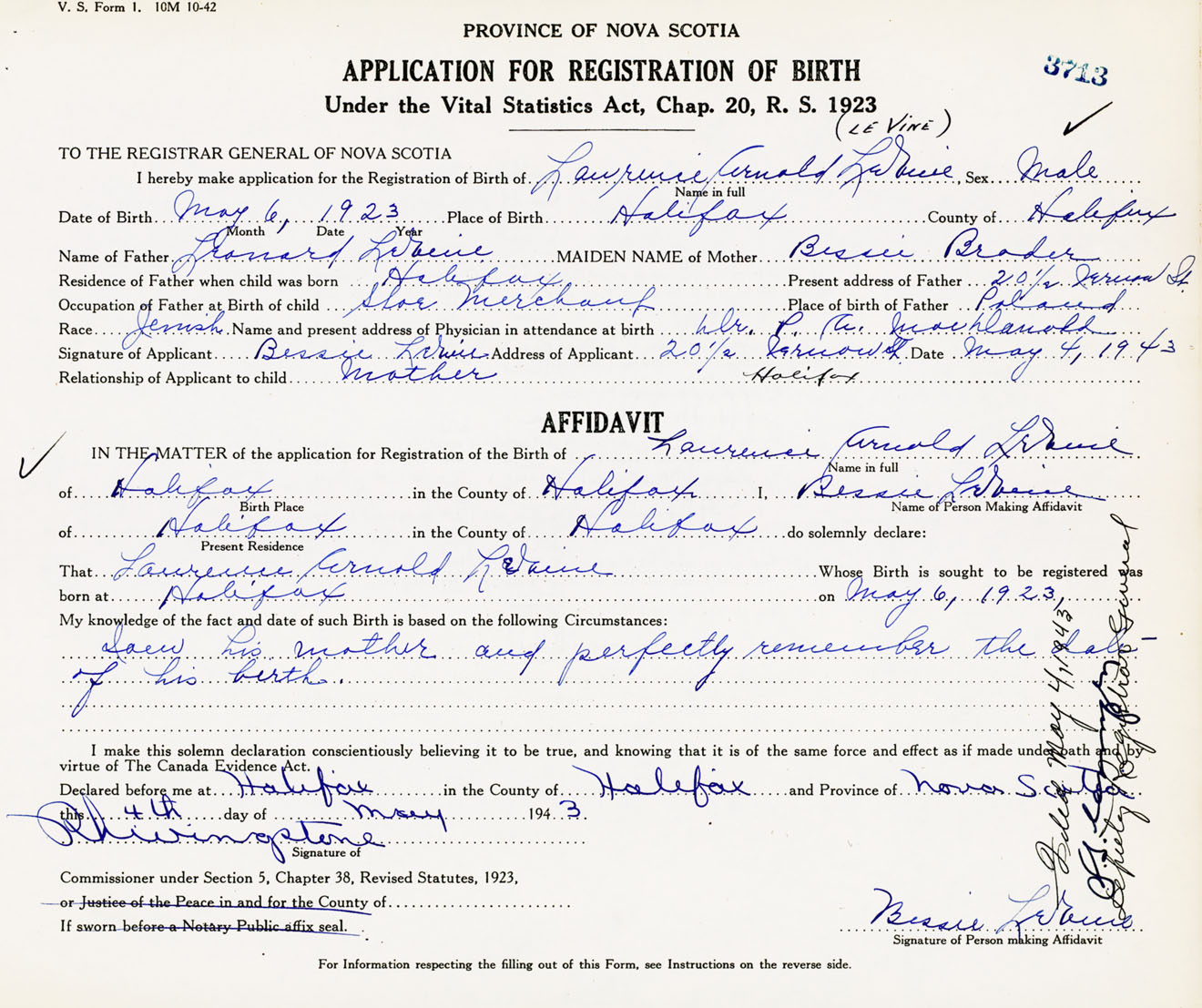 Signature of Applicant Bessie LeVine Address of Applicant 20 1/2 Vernon Street, Halifax, NS Date 4 May 1943