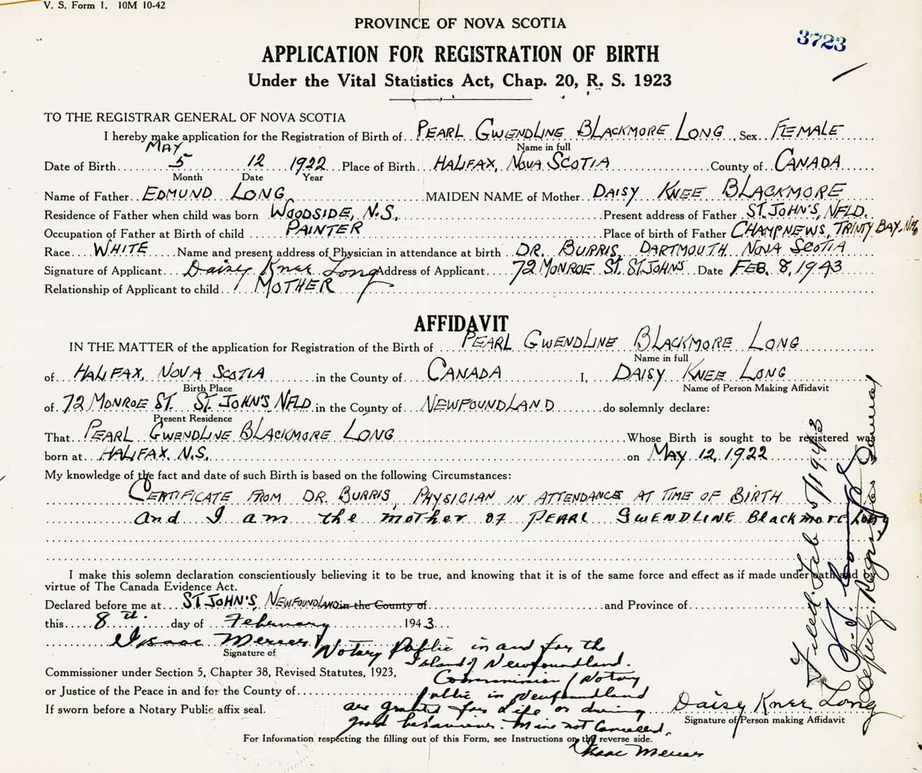 Signature of Applicant Daisy Knee Long Address of Applicant 72 Munroe Street, St. John's, Newfoundland Date 8 February 1943