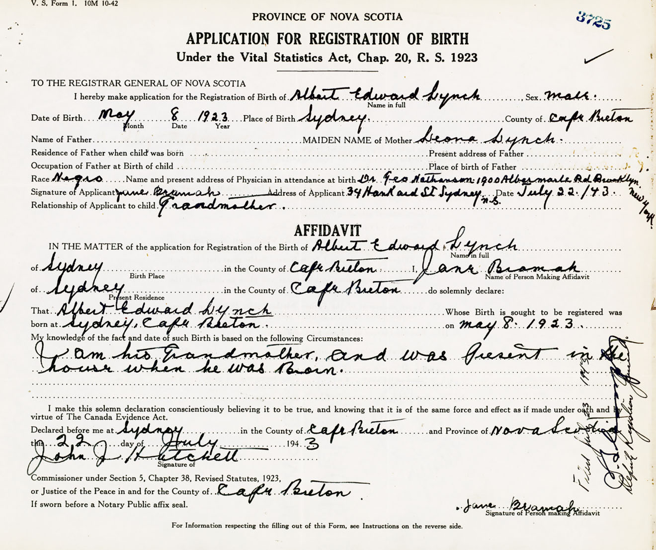 Signature of Applicant June Bramah Address of Applicant 34 Hankard Street, Sydney, Cape Breton Co., NS Date 22 July 1943