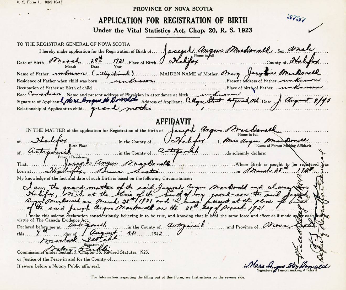 I am the grandmother of the said Joseph Angus MacDonald and I was in Halifax, NS at the time of the birth of my grandson, the said Joseph Angus MacDonald on March 28, 1921 and I was present at the place of birth of the said Joseph Angus MacDonald on the 28the day of March, 1921.