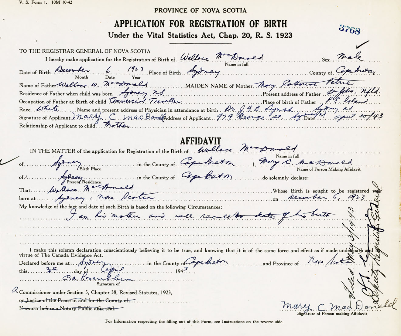 I hereby make application for the Registration of Birth of WallaceMacDonald Sex Male