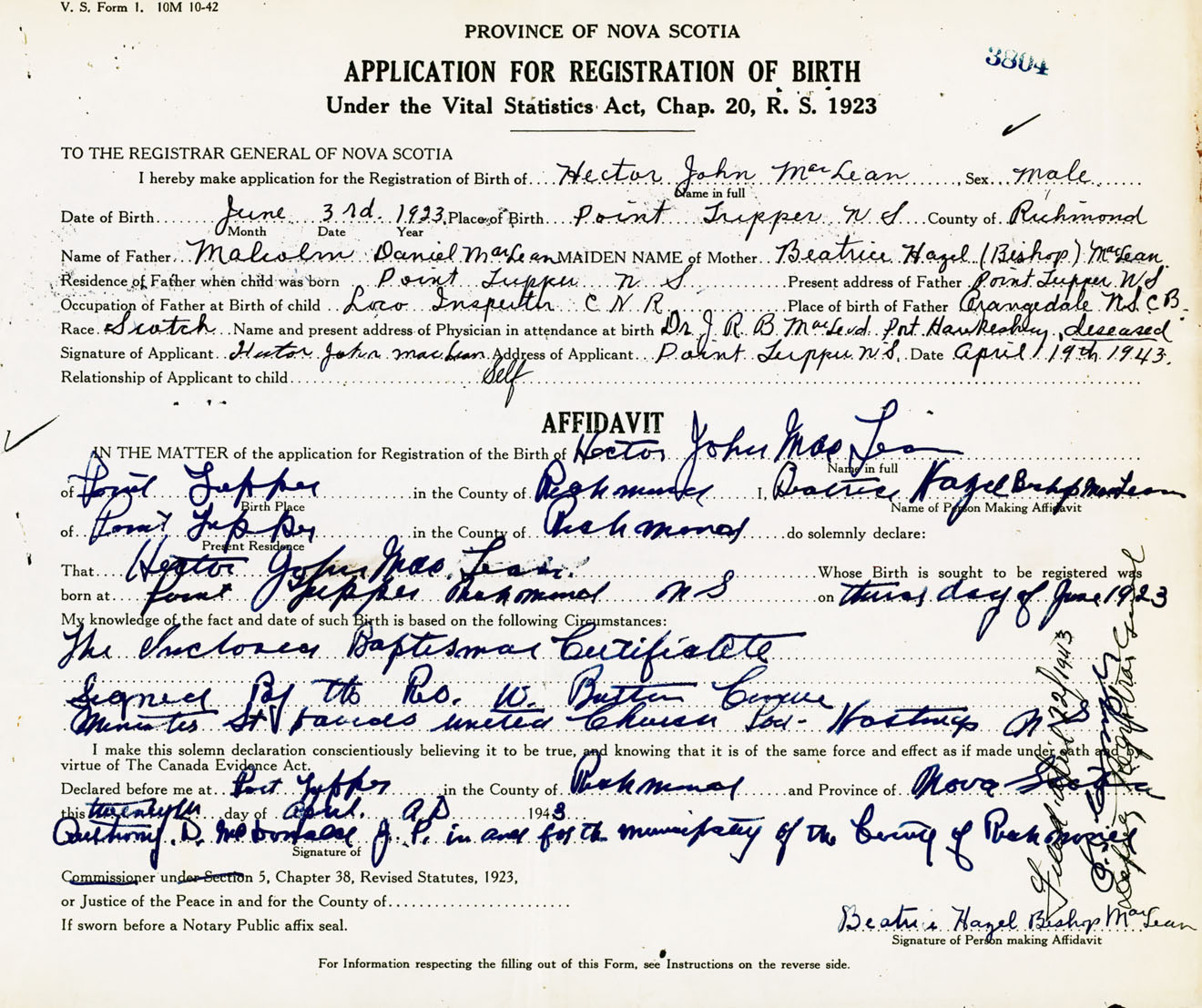 Signature of Applicant Hector John MacLean Address of Applicant Point Tupper, Richmond Co., NS Date 19 April 1943