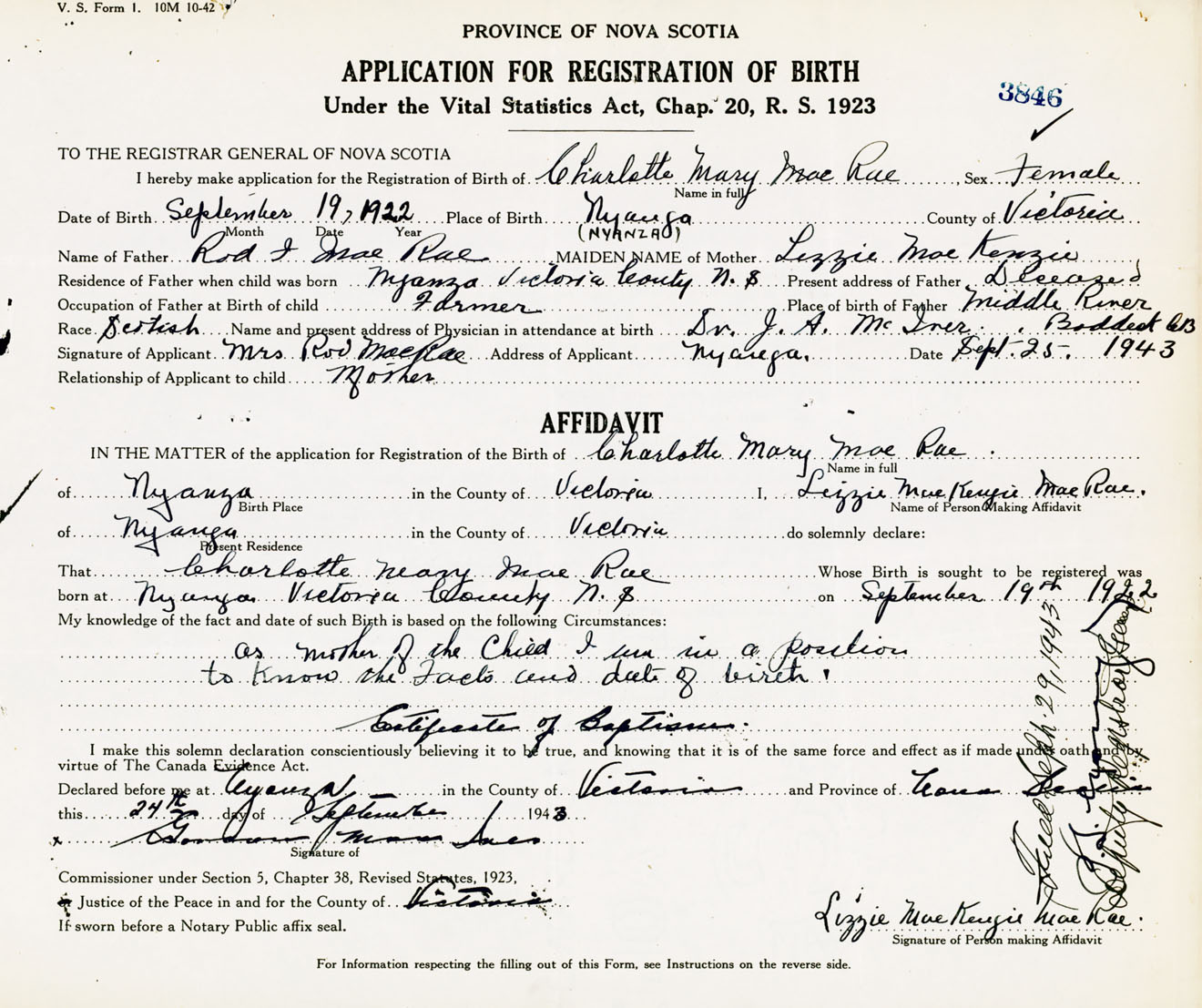 Signature of Applicant Mrs. Rod MacRae Address of Applicant Nyanza, Victoria Co., NS Date 25 September 1943