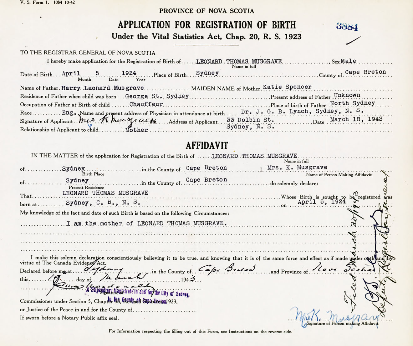 Signature of Applicant Mrs. K. Musgrave Address of Applicant 33 Dolbin Street, Sydney, Cape Breton Co., NS Date 18 March 1943