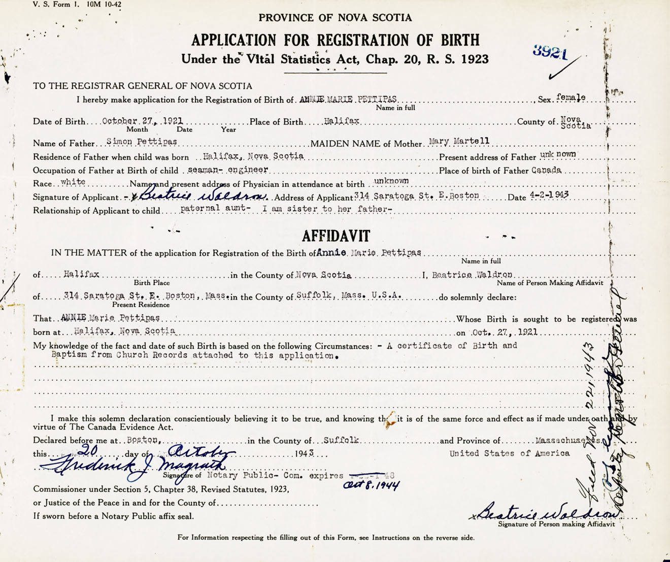 Signature of Applicant Beatrice Waldron Address of Applicant 314 Saratoga Street East, Boston, Massachusetts, USA Date 2 April 1943