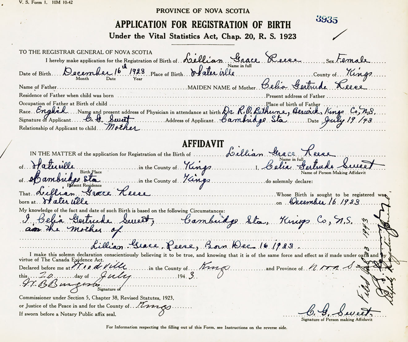 I Celia Gertrude Sweet, Cambridge Station, Kings Co., NS am the mother of Lillian Grace Reese, Born December 16, 1923