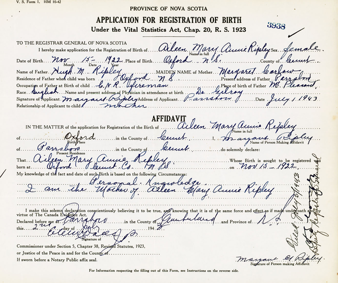Signature of Applicant Margaret Ripley Address of Applicant Parrsboro, Cumberland Co., NS Date 1 July 1943