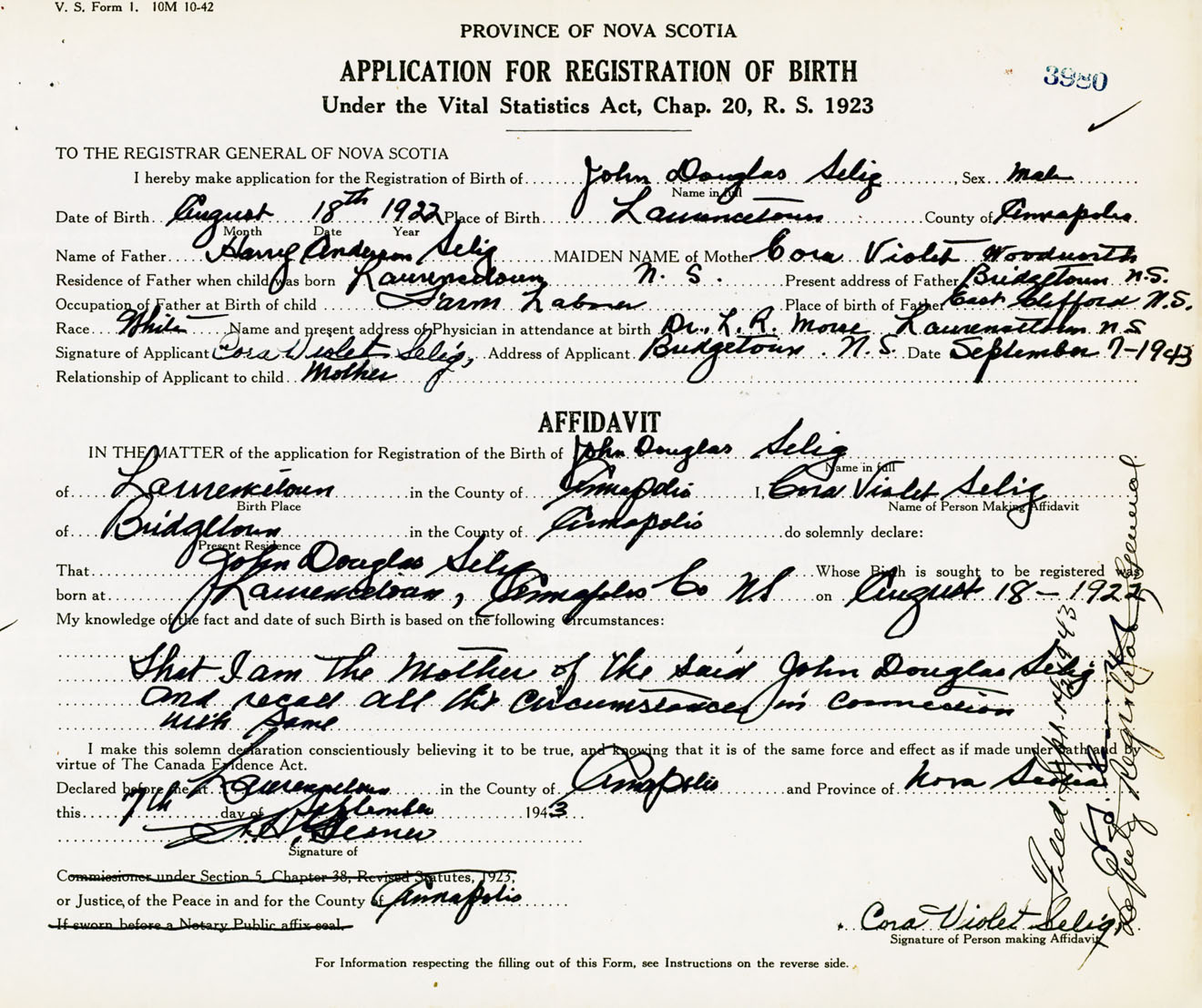Signature of Applicant Cora Violet Selig Address of Applicant Bridgetown, Annapolis Co., NS Date 7 September 1943