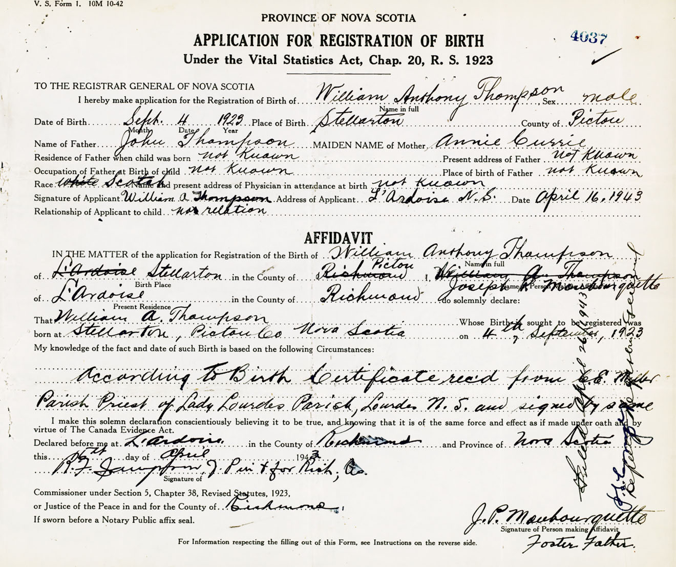 Signature of Applicant William A. Thompson Address of Applicant L'Ardoise, Richmond Co., NS Date 16 April 1943