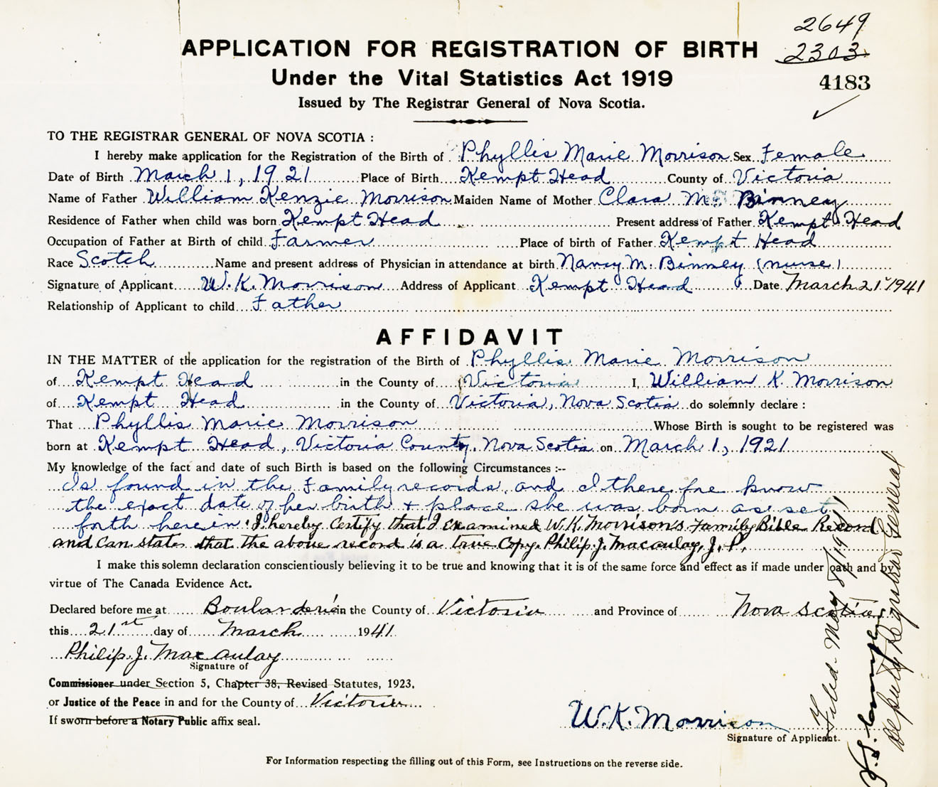 Signature of Applicant W. K. Morrison Address of Applicant Kempt Head, Victoria Co., NS Date 21 March 1941