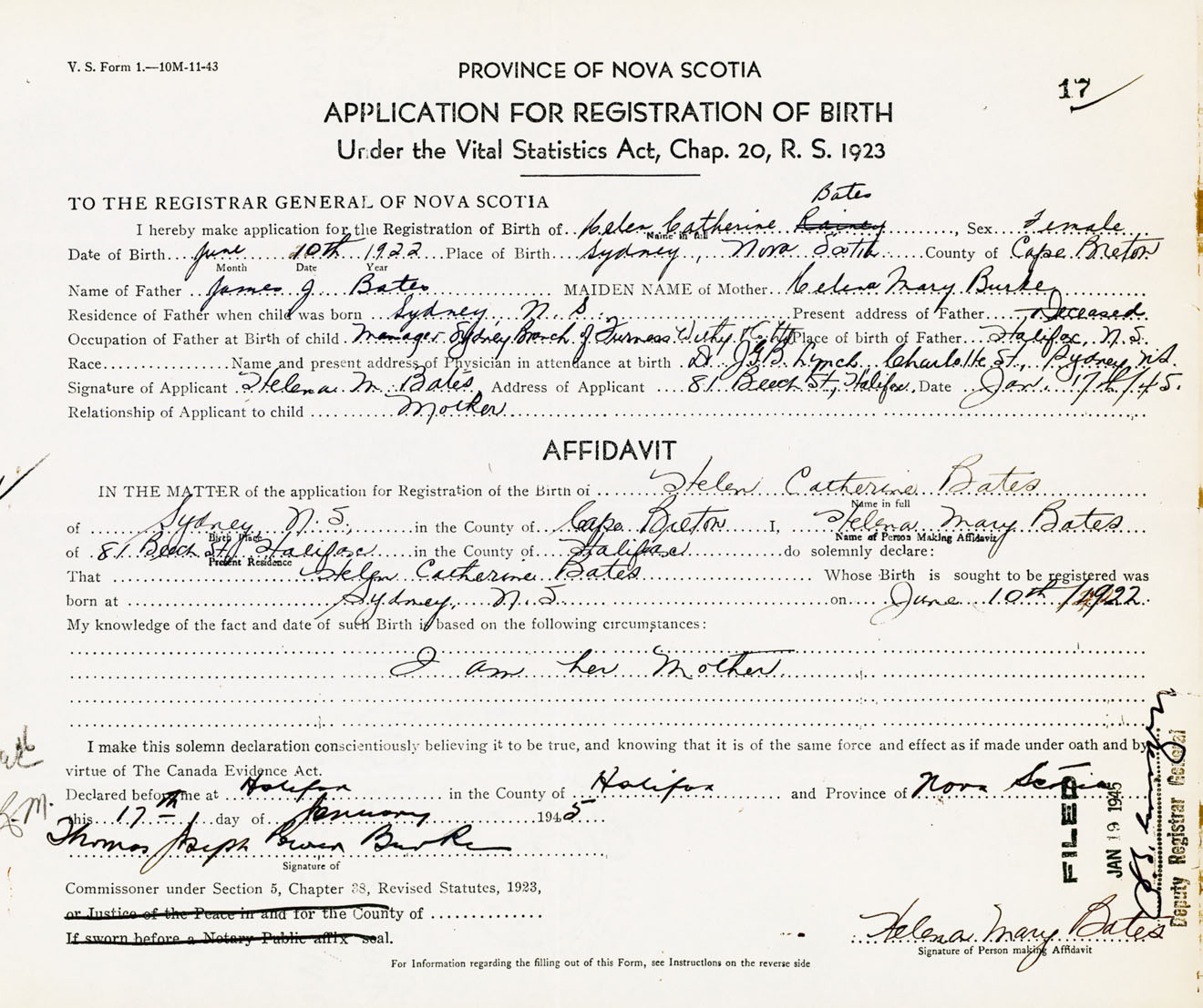 Signature of Applicant Helena M. Bates Address of Applicant 81 Beech Street, Halifax, NS Date 17 January 1945