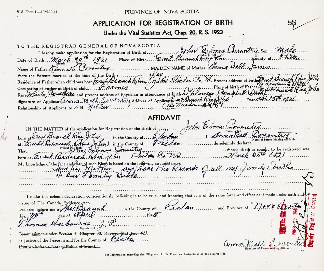 Signature of Applicant Anna Bell coventry Address of Applicant Via Meadowville, RR #1, East Branch River John, Pictou Co., NS Date 25 April 1945