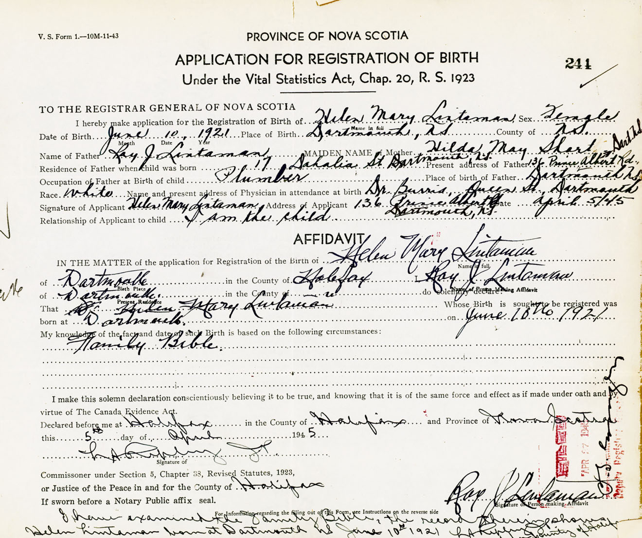 Signature of Applicant Helen Mary Lintaman Address of Applicant 136 Prince Albert Road, Dartmouth, NS Date 5 April 1945