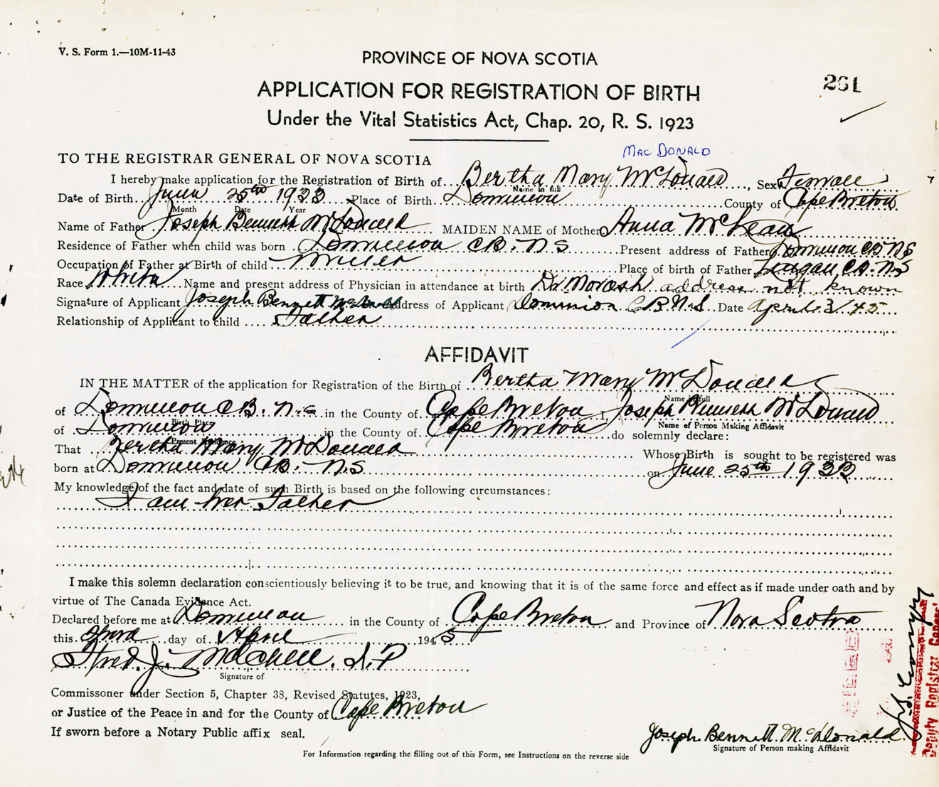 IN THE MATTER of the application for the Registration of the Birth of Bertha MaryMcDonald