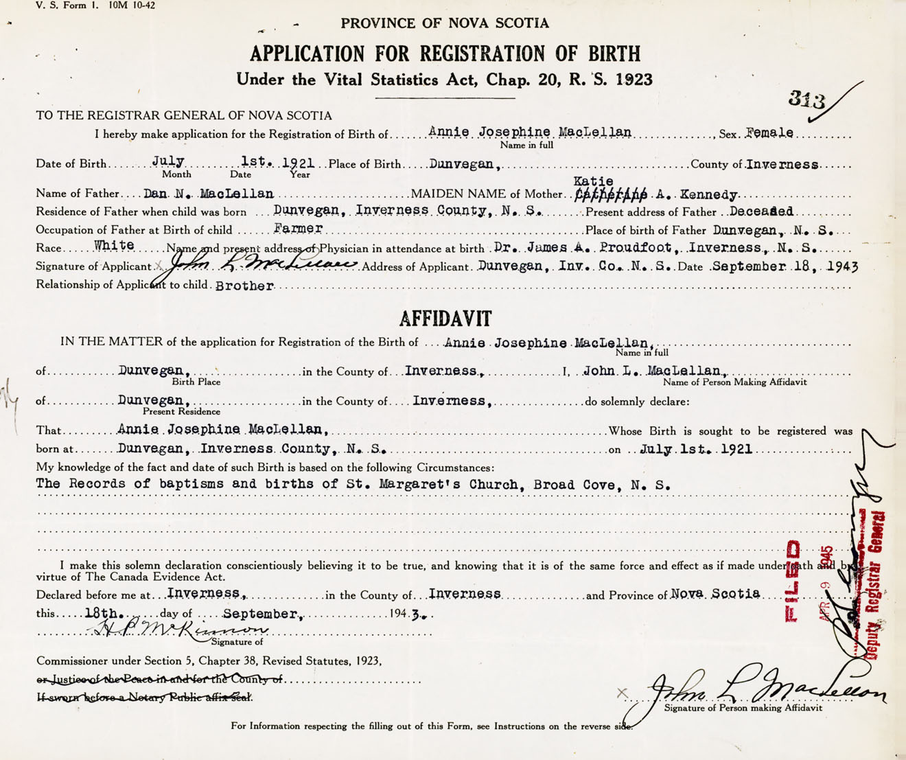 I hereby make application for the Registration of Birth of Annie JosephineMacLellan Sex Female