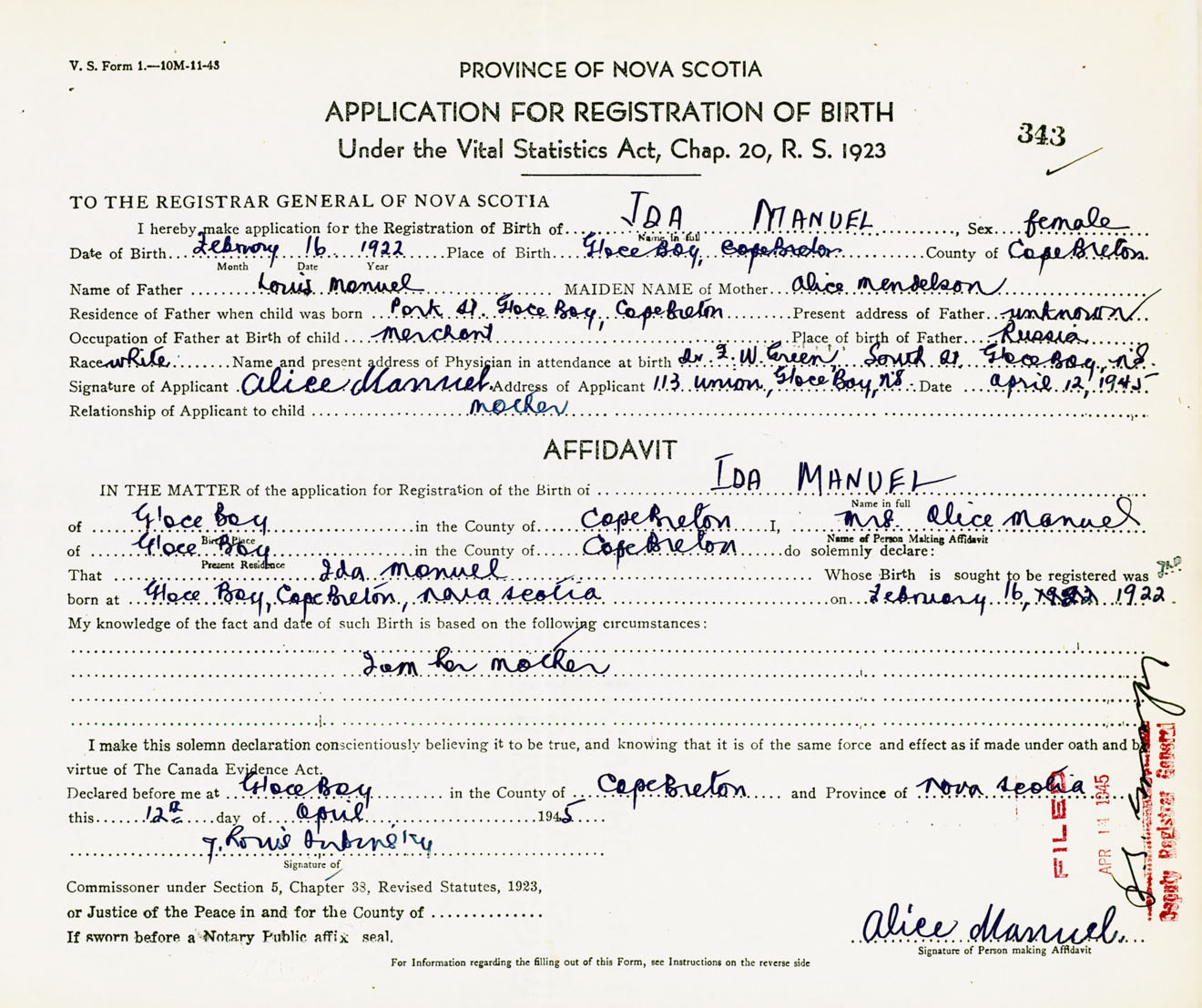 Signature of Applicant Alice Manuel Address of Applicant 113 Union, Glace Bay, Cape Breton Co., NS Date 12 April 1945