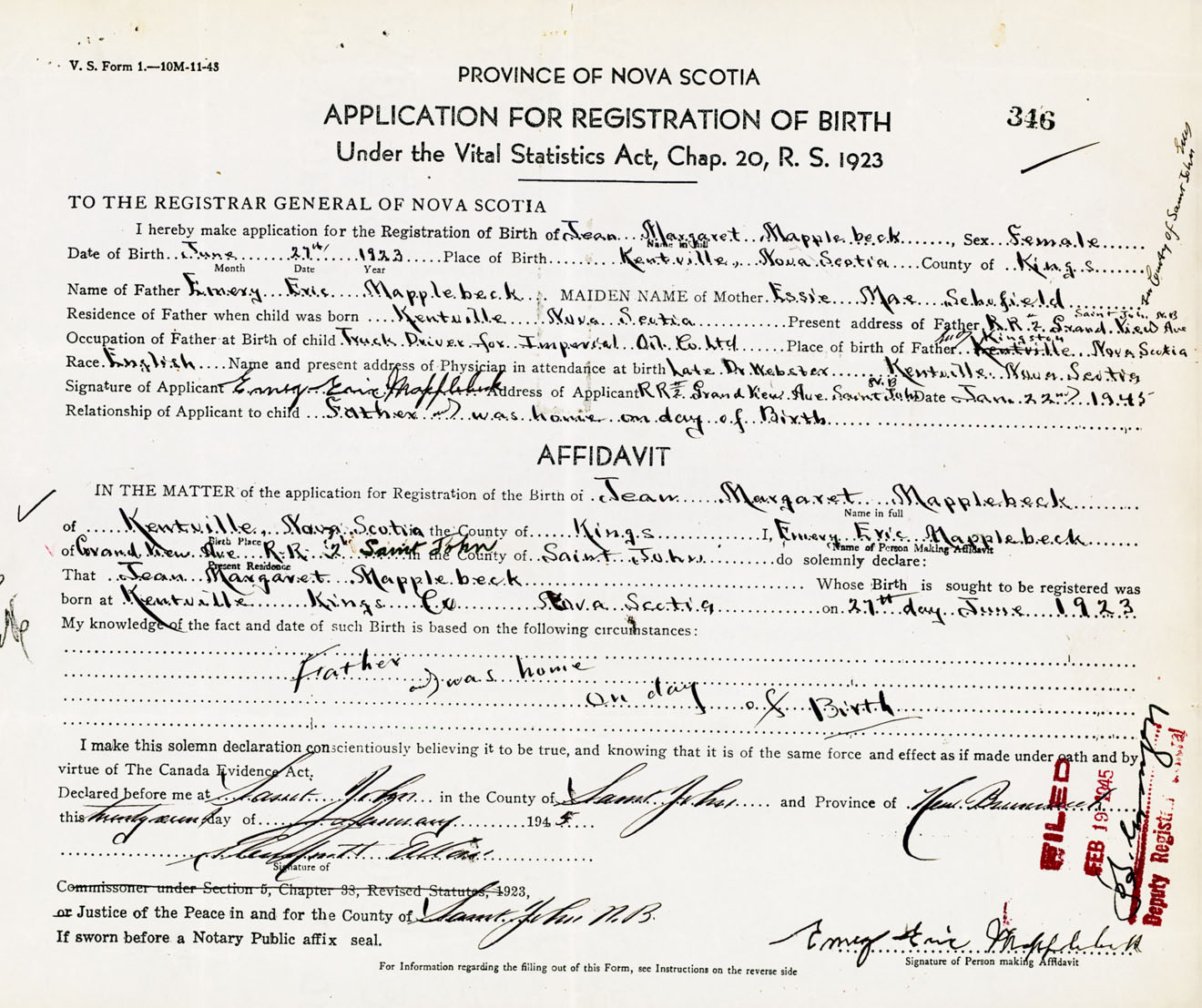 Signature of Applicant Emery Eric Mapplebeck Address of Applicant RR #2, Grand View Avenue, Saint John, New Brunswick Date 22 January 1945