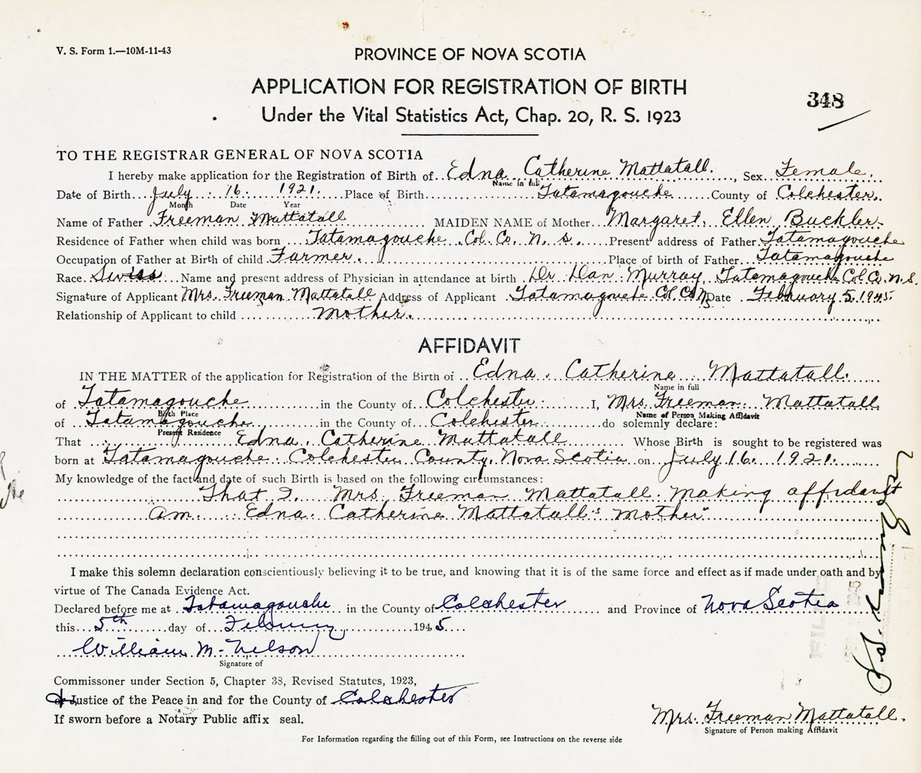 I hereby make application for the Registration of Birth of Edna CatherineMattatall Sex Female
