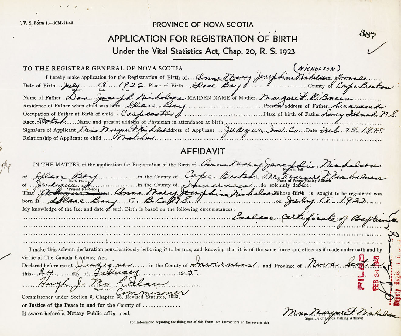 Signature of Applicant Mrs. Margaret Nicholson Address of Applicant Judique, Inverness Co., NS Date 24 February 1945