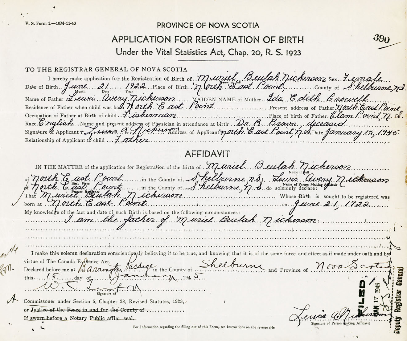 Signature of Applicant Lewis A. Nickerson Address of Applicant North East Point, Shelburne Co., NS Date 15 January 1945