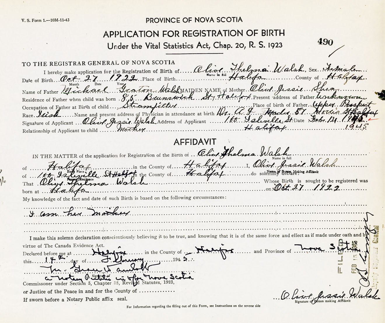 Signature of Applicant Olive Jessie Walsh Address of Applicant 100 Isleville Street, Halifax, NS Date 14 February 1945